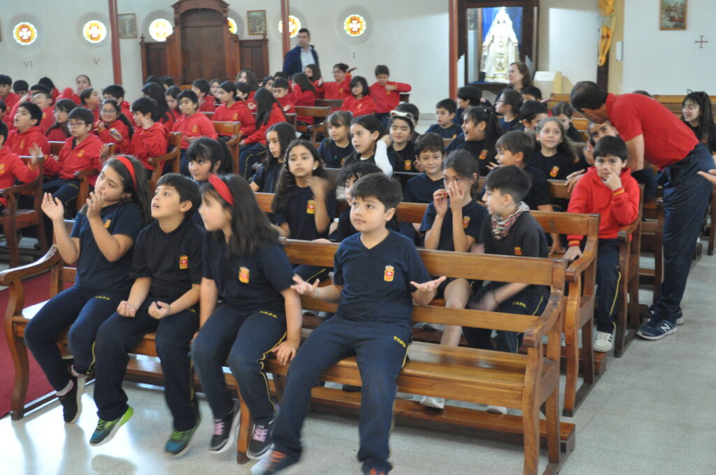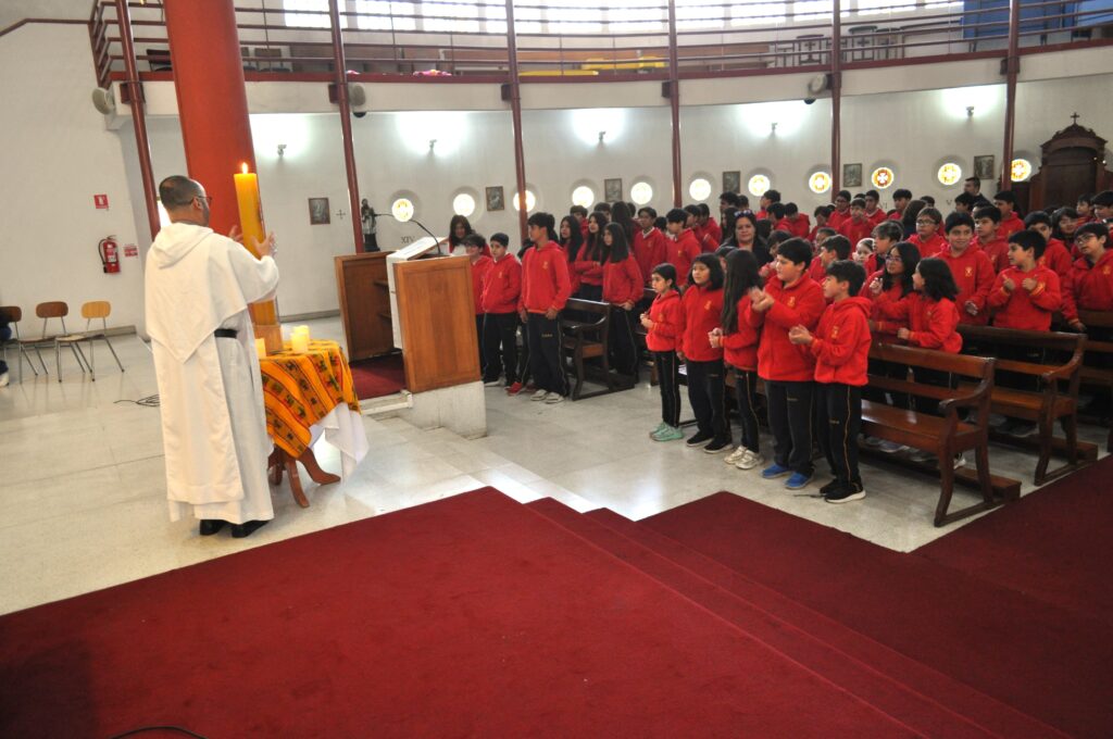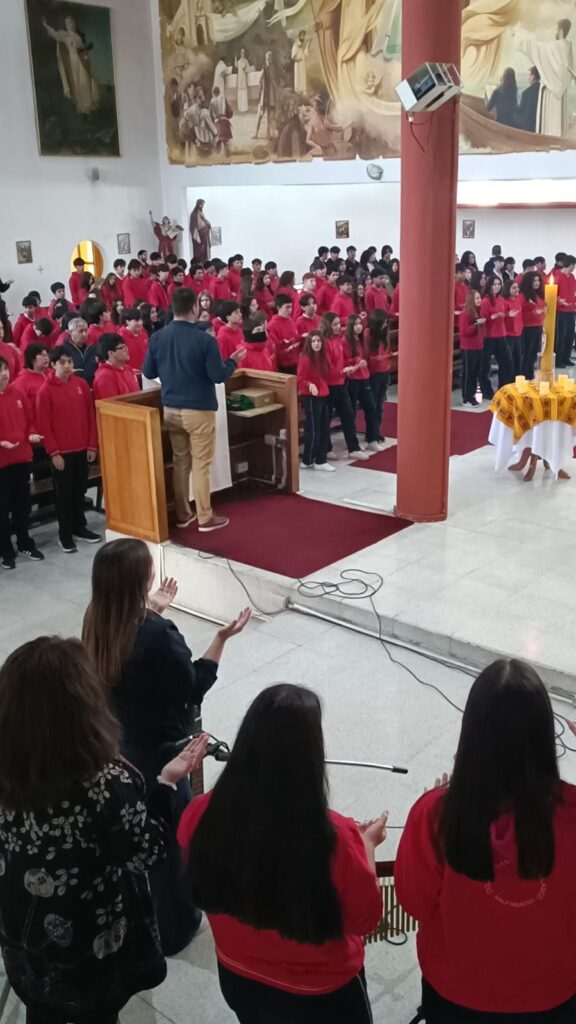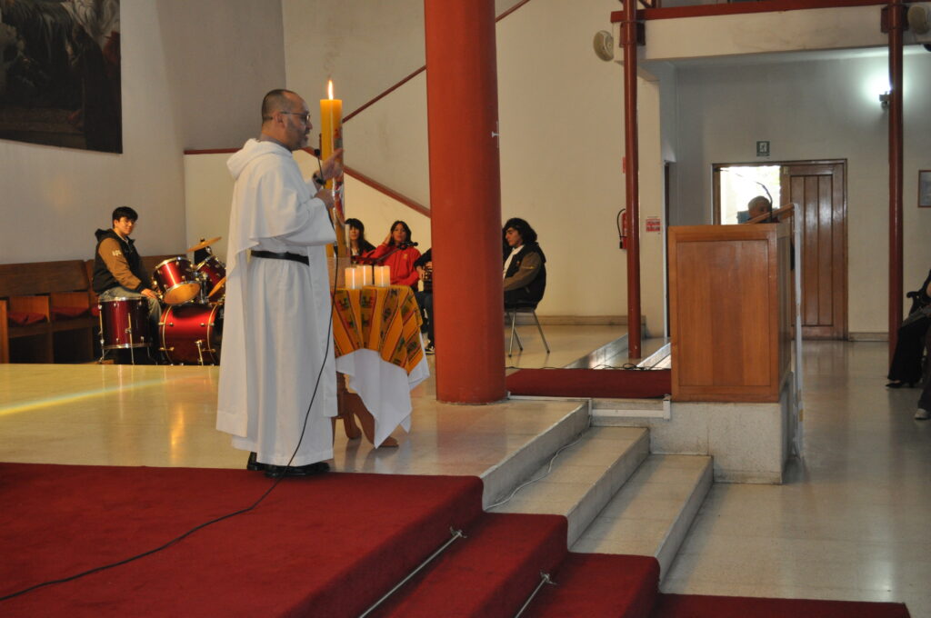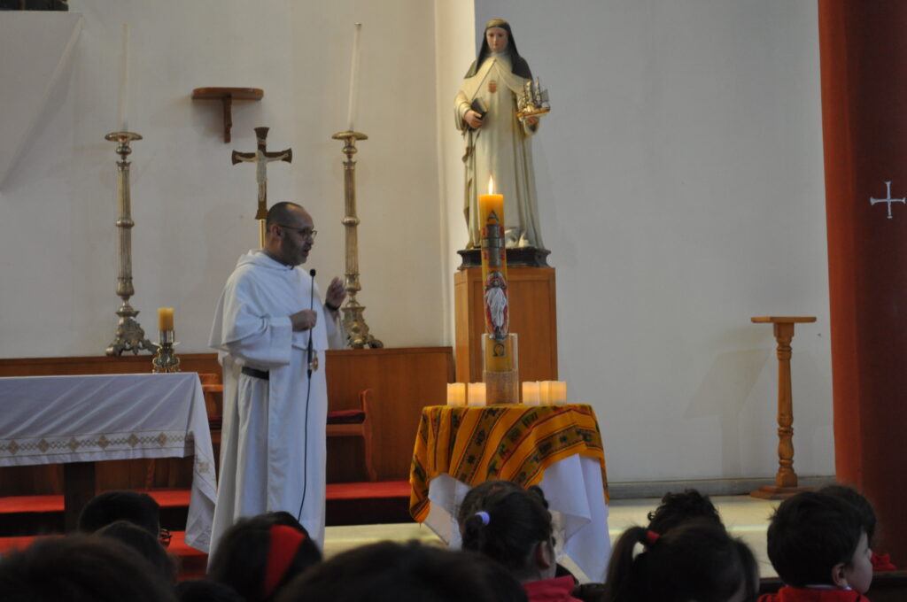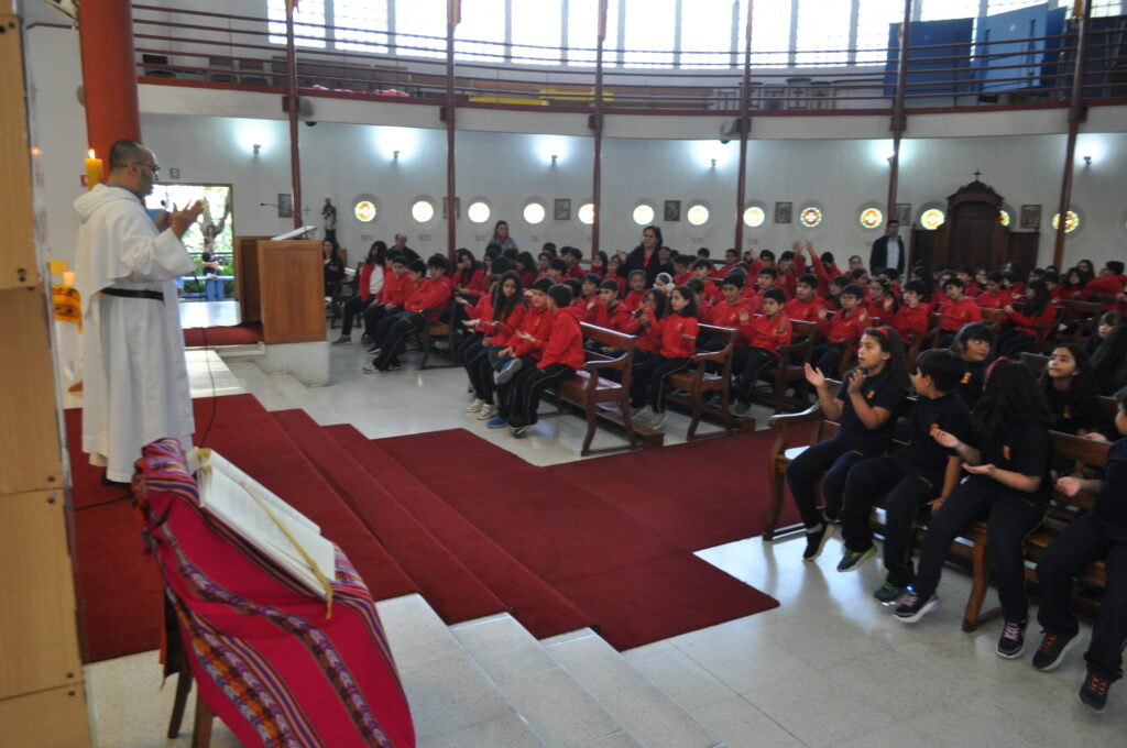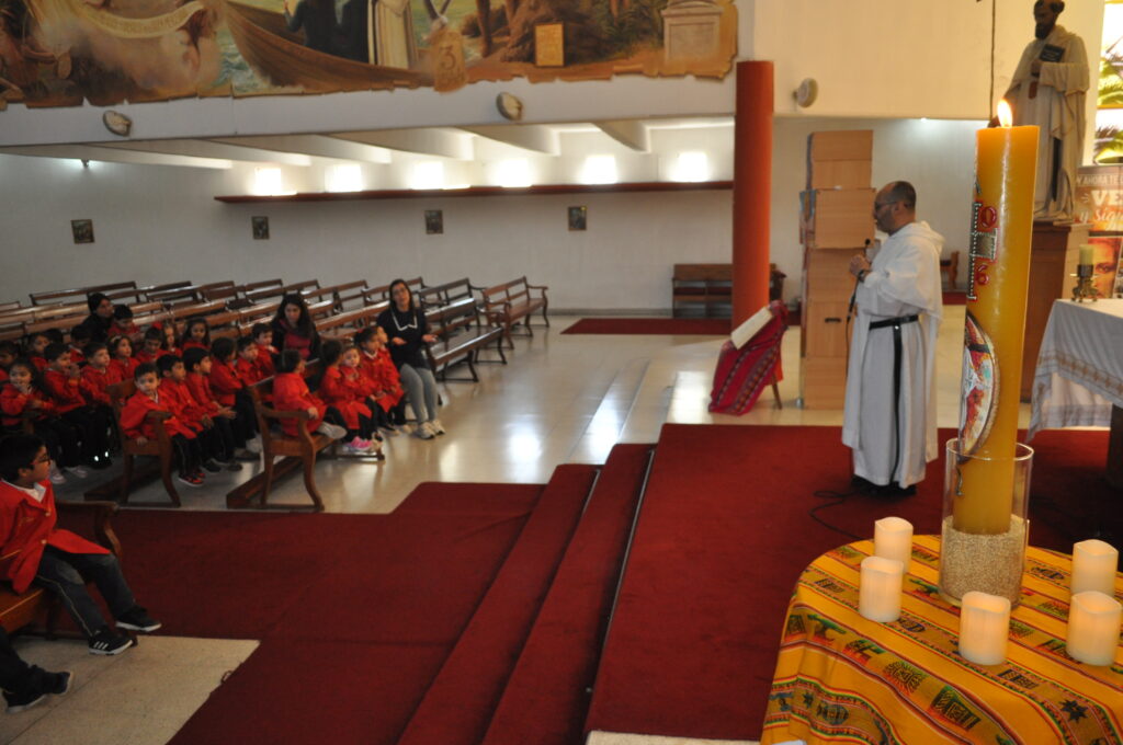 Hemos celebrado con diferentes Liturgias la Pascua. El primer momento se vivió con los estudiantes de 8° básico a 4to medio.  El padre Carlos Ortega hizo ingreso con el Cirio Pascual encendido, signo de la luz que ha vencido a la muerte.  El padre Carlos invitó a la comunidad a anunciar la Buena Nueva con alegría, buen semblante y con la apertura de corazón.